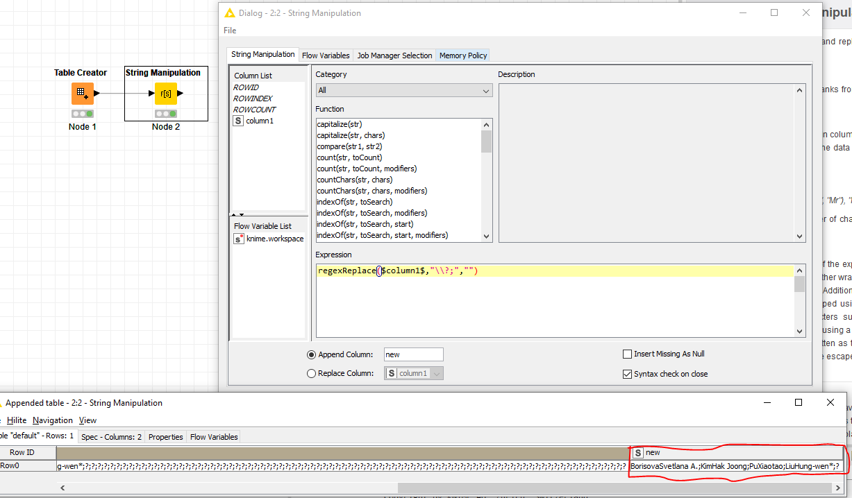 我正在使用KNIME,并试图在字符串操作节点中使用regexReplace($col1$,"[?;]","")或regexReplace($col1$,"?;",""),但是所有的实例都是?和;被移除。