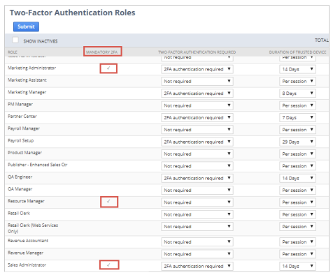 从2018.2开始,NetSuite开始在所有NetSuite帐户中强制执行双因素身份验证(2FA)要求。默认情况下,管理员和其他高度特权的角色被指定为2FA必需的角色,并且不能删除此要求。任何符合2FA要求的标准或自定义角色都在“双因素身份验证角色”页面的“强制2FA”列中指示。
