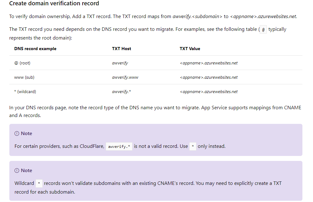 www CNAME 1h mywebsite.azurewebsites.net带有awverify子域的条目用于向Azure“证明”,当您将、一个活动站点及其DNS域名迁移到App时,您拥有该域,即DNS名称已经在为实时流量服务。如果您的自定义域尚未用于实时通信,请执行以下操作。您不需要在DNS区域中添加这样的awverify子域,只需删除它。