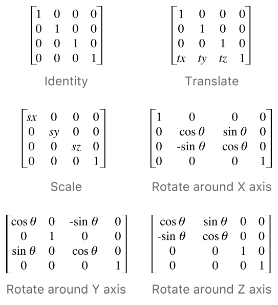 下图显示了您可以进行的一些更常见的转换的矩阵配置。将任意坐标乘以恒等变换返回完全相同的坐标。对于其他转换,如何修改坐标完全取决于您更改的矩阵组件。例如,为了仅沿x轴进行转换,您将为转换矩阵的tx组件提供一个非零值,并将ty和tz值保留为0。对于旋转,您将提供适当的正弦和余弦值的目标旋转角度。矩阵配置