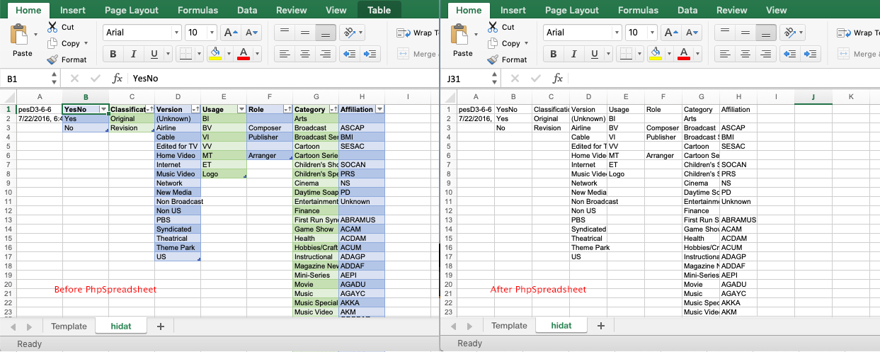 我有一个用PhpSpreadsheet读写的Excel文件。我所有的表和引用都在这个过程中消失了。是否有我需要设置为true/false的标志,还是表只是PhpSpreadsheet无法处理的?参见导出前后的屏幕截图。