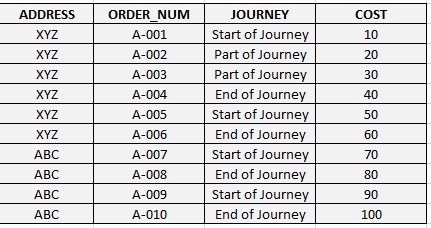 我想把地址除以每一次旅程(“旅程的开始”到“旅程的结束”,中间的所有“旅程的一部分”构成一次旅程),并将成本相加,这样每个地址就可以根据旅程的次数有多行,如下所示: