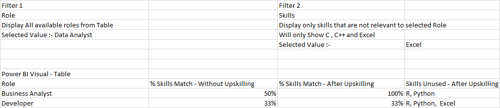 因此,对于业务分析师-- Visual Table %技能中的第1行技能--只有SQL来自数据分析人员技能与业务分析人员技能的匹配,因此它的50%在上升技能之前。