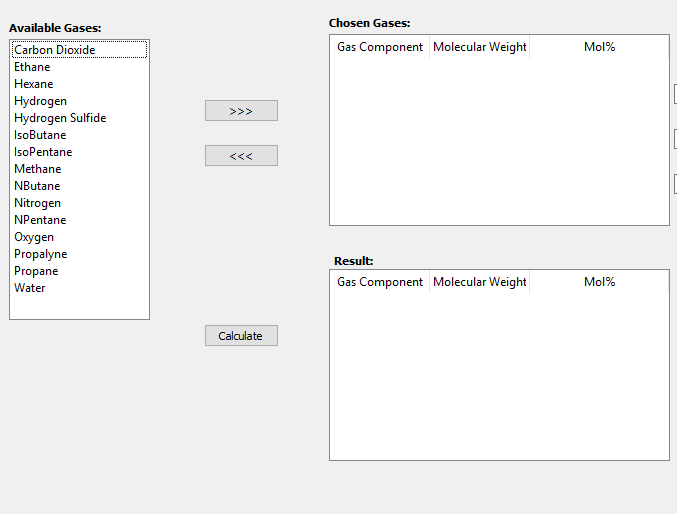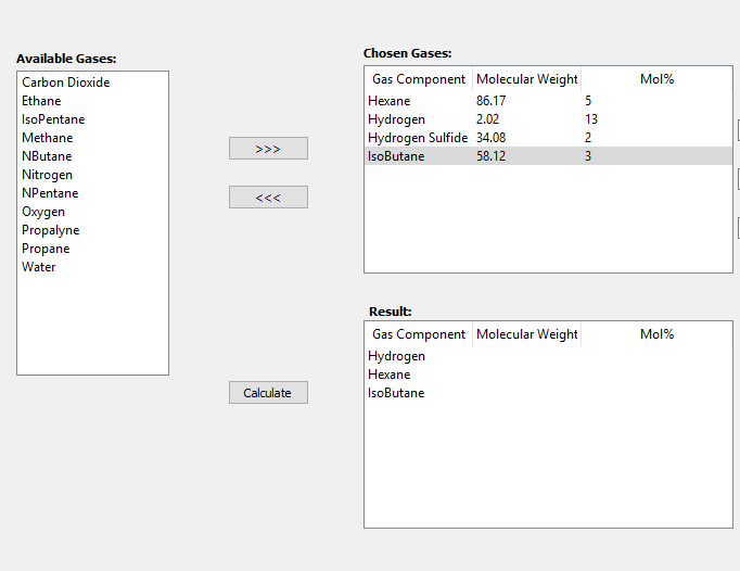 我有一个GUI,用户从列表中选择天然气组件,并将其移动到“选择”,另一个按钮从有列的“selects”获取文本: gas组件,分子量,Mol%。前两列从我创建的字典中获取信息,最后一列是用户输入。
