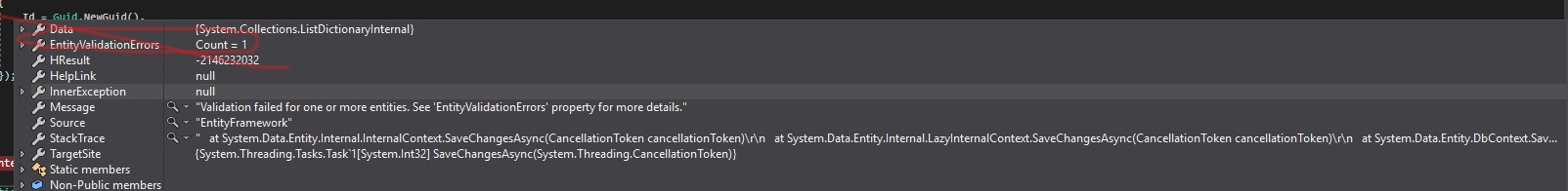 我通过检查字符的长度来解决这个问题,根据您在对象上放置的数据注释或验证器注释,这可能是不同的错误。若要双重检查您的验证是否正确,您可以检查EntityValidationErrors下的异常堆栈以获得更多有关它的深度信息,请参见下面的图像。