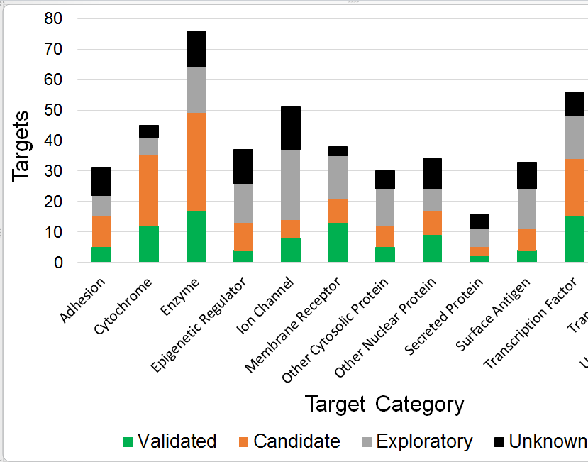 dataf<-data.frame(Target_Category,Validated,Candidate,Exploratory,Unknown)我在下面创建了堆叠的条形图: