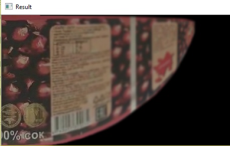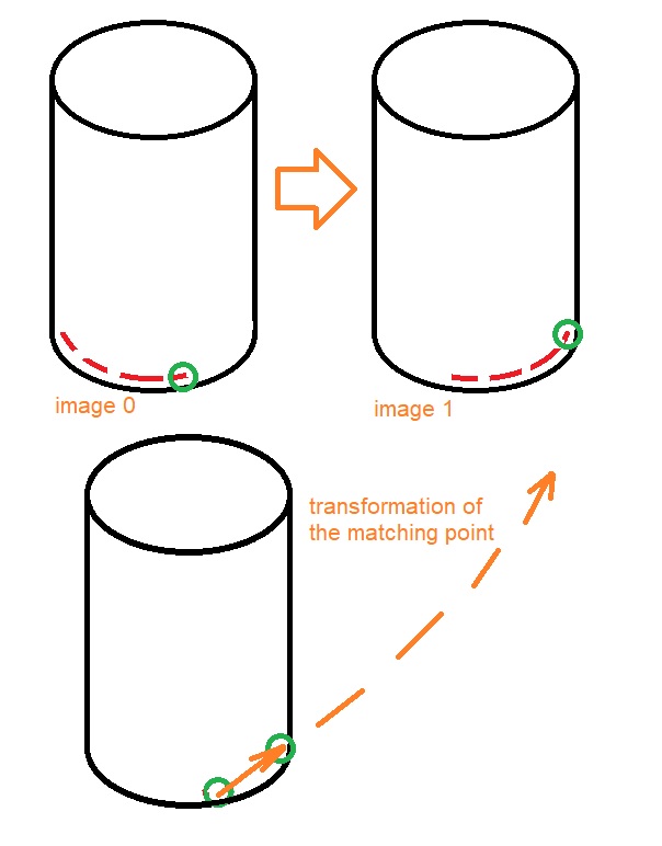 我认为你的方法失败了,因为你实际上观察到瓶子有一个稍微向下倾斜的摄像头视图,或者瓶子不在屏幕的中间。我试着用图像来描述。我在瓶子上写了一些红色的文字。例如,该算法在捕获的圆形对象底部找到匹配点对(绿色)。注意,这个点不仅移动正确,而且对角也向上移动。然后,该程序计算转换,同时考虑到稍微向上移动的点。这种情况继续一帧一帧地恶化。