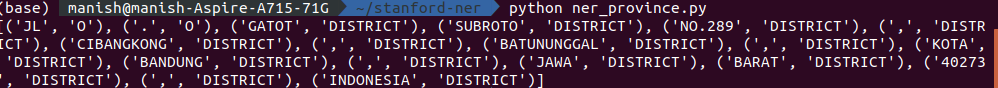 我正在尝试使用斯坦福CRF-NER来训练我自己的地址分类器模型,但是性能很低。我对我培训过的培训数据的格式感到困惑。培训数据通常是地区、城市、省份及其各自标签的列表。但是该模型并没有将相应的地址标记标记到其令牌上。