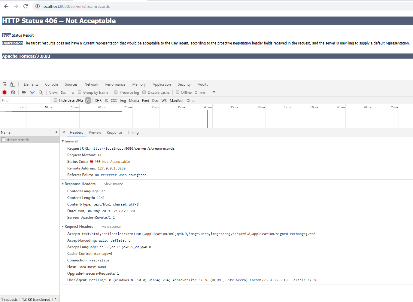 第二件事是,您的浏览器并不要求APPLICATION_OCTET_STREAM --您可以通过Accept头值看到这一点。APPLICATION_OCTET_STREAM映射到application/octet-stream -您来自浏览器的请求需要将它包含在Accept头值中,这样Accept就能够识别控制器中应该调用的方法。