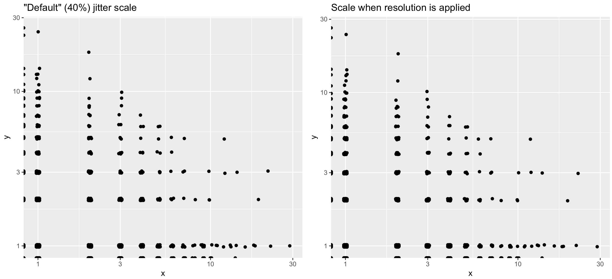 geom_jitter采用高度/宽度参数来表示抖动的宽度,默认值为40%。当添加日志刻度时,这40%似乎应用于原始值。但是,如果要调整此参数,则在日志转换后应用该值。