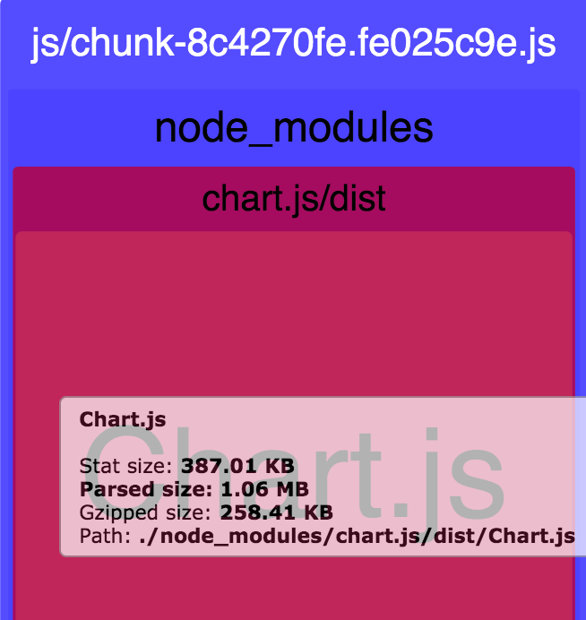 我正在努力缩小我的SPA构建的大小,它使用vue-cli build进行构建。我正在使用Chart.js,在构建应用程序之后,我运行了webpack-bundle-analyzer,它显示了Chart.js的全尺寸,而不是chart.min.js。