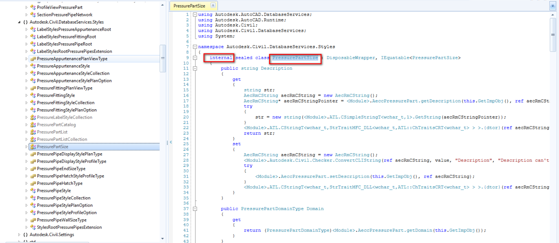 由于保护级别的关系,Autodesk.Civil.DatabaseServices.Styles.PressurePartSize显示了可访问的错误。