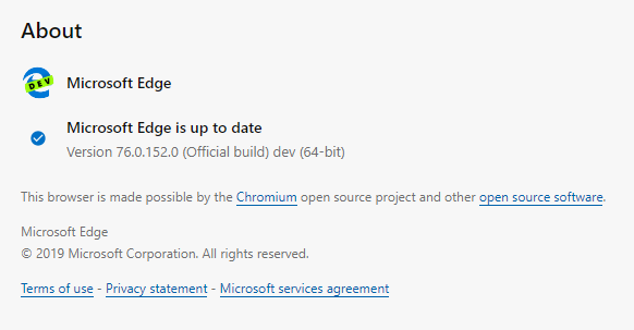 Windows 10上安装的my Edge Dev版本为76.0.152.0 (官方版本build 64位):