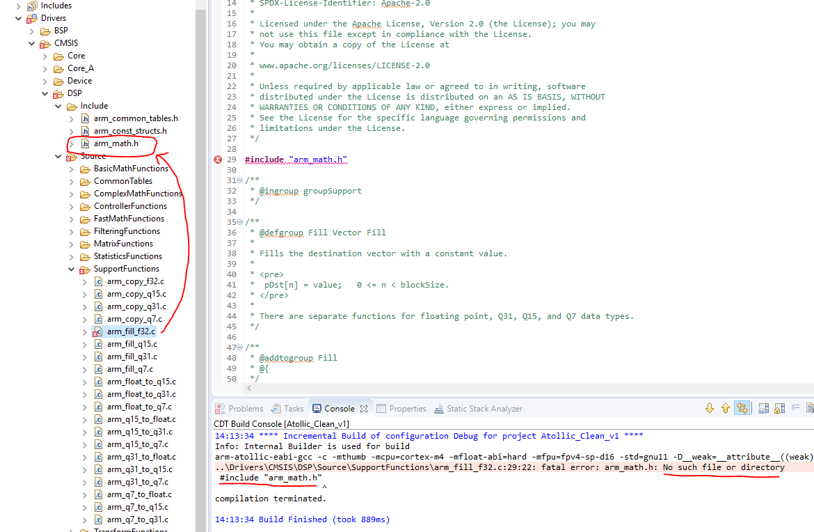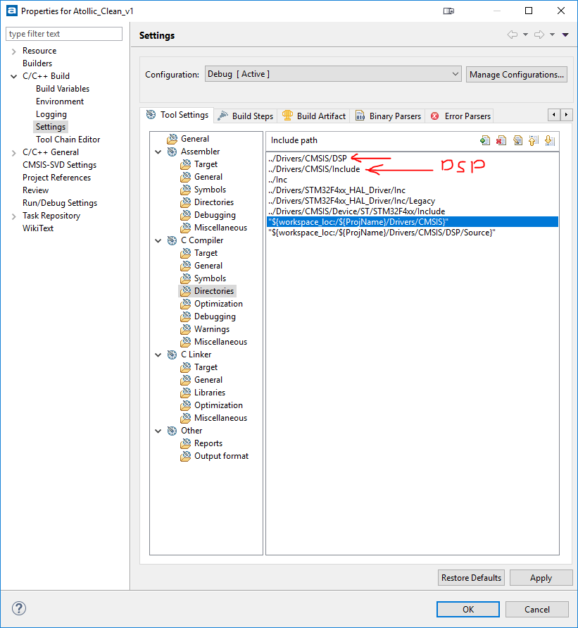 但是,这个过程也会调用许多错误,因为包含的函数无法识别它们的头依赖项(例如#include arm_math.h)。我感到困惑的是,main.c能够识别#include arm_math.h命令,但所包含的函数却不识别,但我仍然试图通过将CMSIS添加到包含的目录中来修复这个问题(在'Build properties --> C/C++ Build --> Settings -> Tool Settings --> C Compiler -> directories‘)中找到这个问题。然而,这也不能解决当前的问题。
