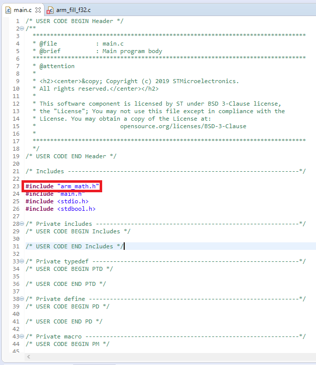 我尝试手动下载相应的CMSIS包(STM32Cube_FW_F4_V1.24.0),并将相应的DSP包放到项目文件结构中。这就允许使用DSP函数,例如#include arm_math.h或arm_rfft_fast_instance_f32 S;,这些函数也可以通过使用自动完成功能来调用,因此可以被IDE识别。