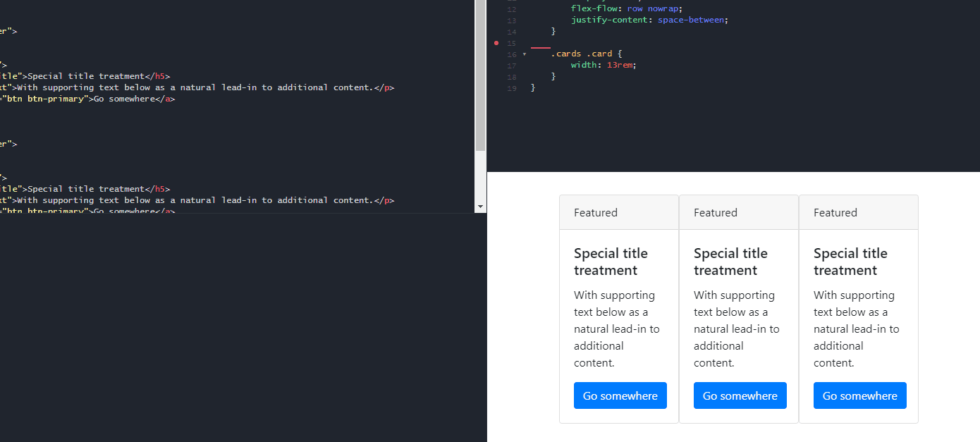 我把较大的设备作为576 as和大。您可以在那里设置媒体断点,并将.cards显示为柔性盒。为里面的卡片设置一个固定的with。