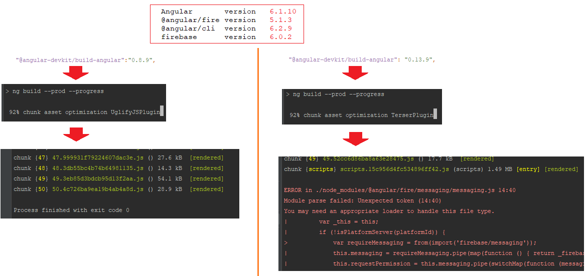 我认为@angular/fire部分的firebase/messaging不兼容由TerserPlugin构建