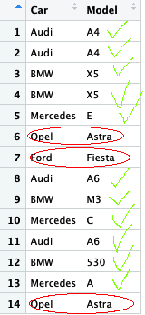 Model<-c("A4","A4","X5","X5","E","Astra","Fiesta","A6","M3","C","A6","530","A","Astra")