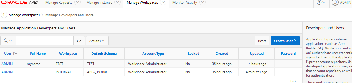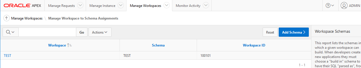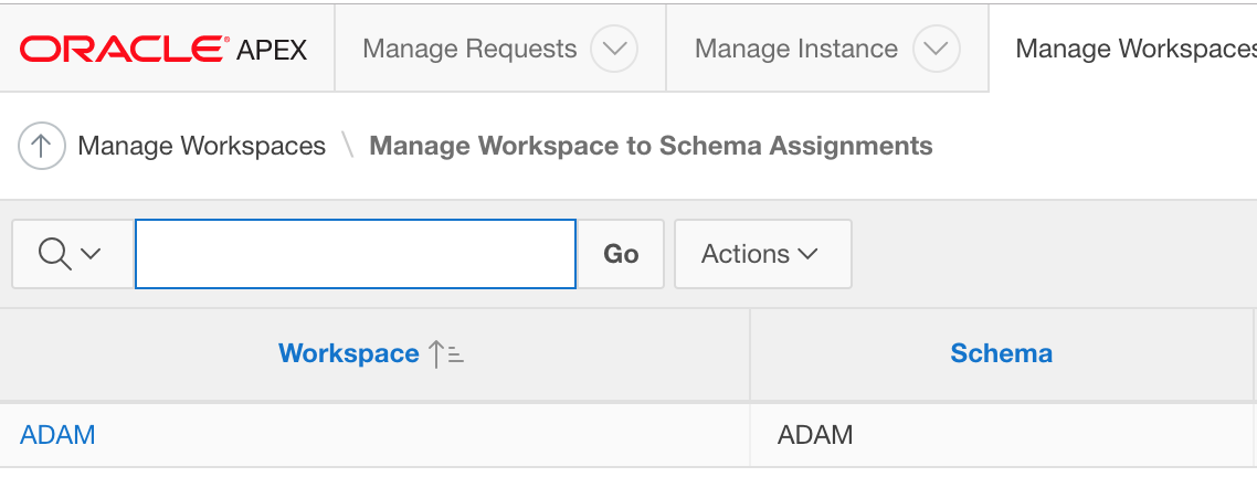要在SQL*Plus中获得到模式分配的工作区,可以使用以下示例,其中APEX_180200是APEX模式,'ADAM‘是工作区。或者登录到APEX的管理端,然后转到"Manage“/ "Manage到Schema分配”--注意在下面的示例中,我的工作区和模式都名为"ADAM“。