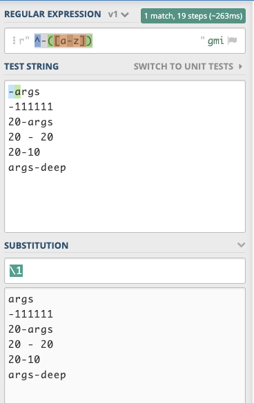 在这里,我们可能只想捕获起始-之后的第一个字母,然后仅用该字母替换它,可能使用类似于以下的i标志表达式: