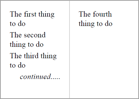用记号笔。要么将所有内容放在fo:table中,然后在fo:table-footer中使用fo:retrieve-table-marker (参见retrieve-table-marker),要么在fo:static-content中为fo:region-after使用fo:retrieve-marker。区别在于,使用fo:table方法,“继续”指示可以立即出现在页面上的最后一个文本之后(如本例中),而不是使用fo:retrieve-marker方法在页脚中的固定位置出现。