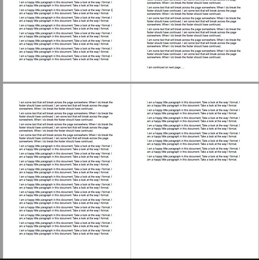 <fo:block margin-top="6pt">I am some text that will break across the page somewhere. When I do break the footer should have continued. I am some text that will break across the page somewhere. When I do break the footer should have continued. </fo:block>