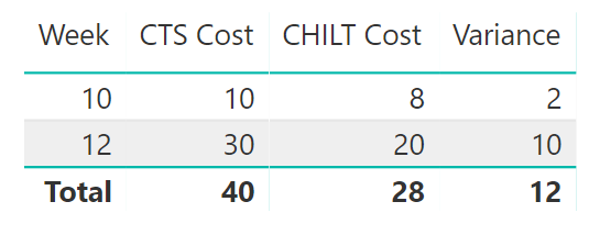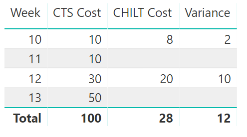 Variance = CALCULATE(SUM(Cost[CTS Cost]) - SUM(Cost[CHILT Cost]),FILTER(Cost,not ISBLANK(Cost[CHILT Cost])))结果: