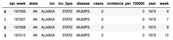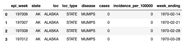 ['197006', 'AK', 'ALASKA', 'STATE', 'MUMPS', '0', '0'],