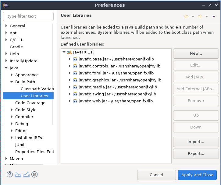 asus@asus-pc:/usr/share/openjfx/lib$ 然后在Eclipse中创建了一个库。