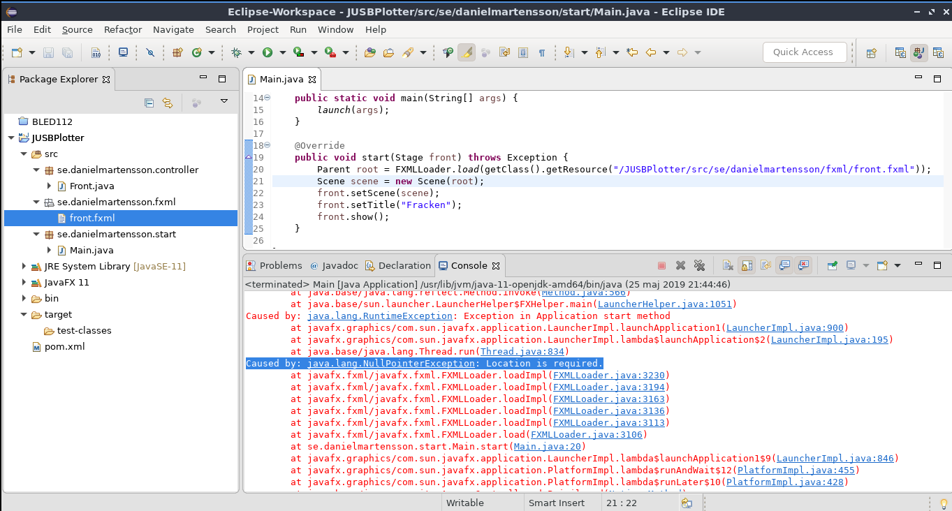 Parent root = FXMLLoader.load(getClass().getResource("/JUSBPlotter/src/se/danielmartensson/fxml/front.fxml"));