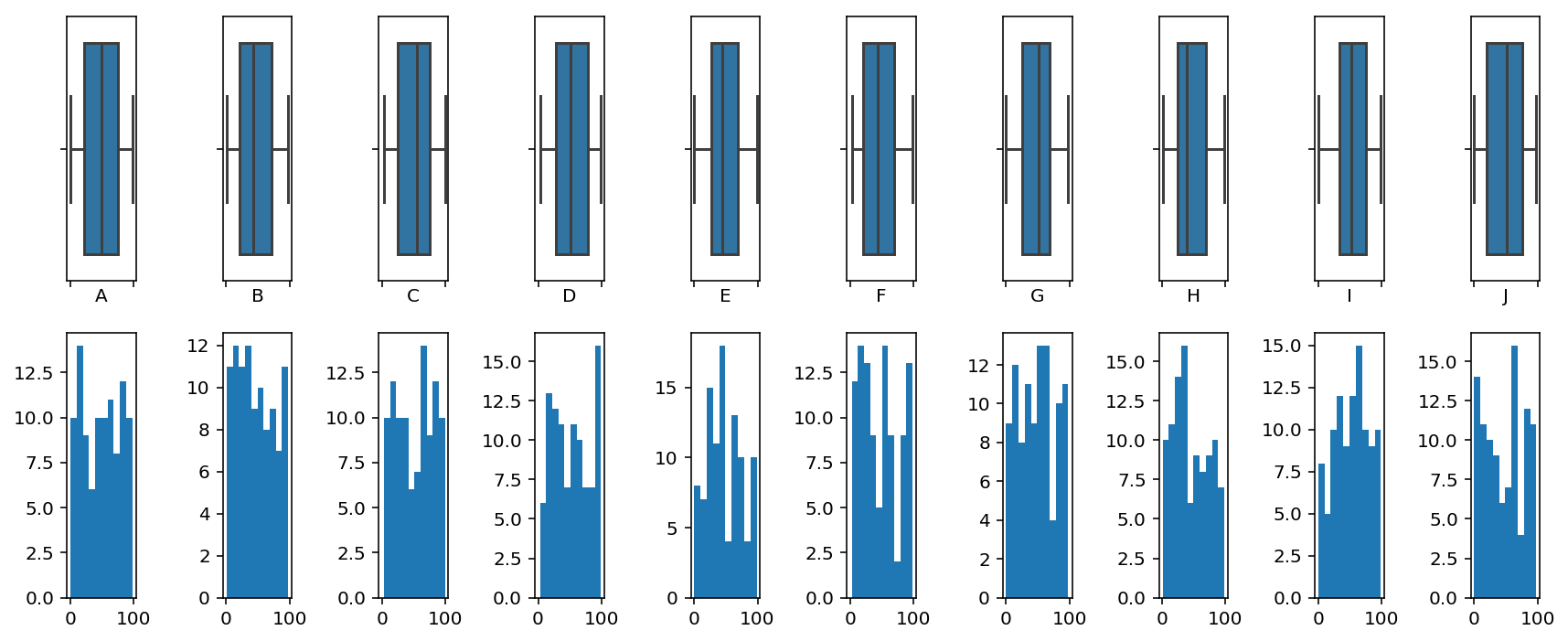 您有10列,每个列创建两个子图:一个方框图和一个直方图。所以你总共需要20位数。您可以通过创建一个由2行10列组成的网格来做到这一点。