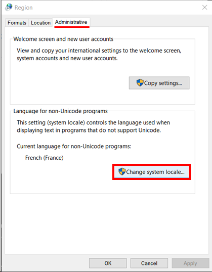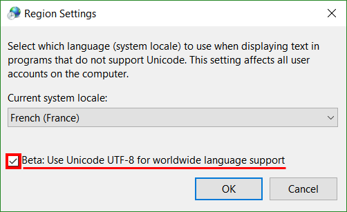 解决方案是修改Windows中的参数,以便正确使用UTF-8 .它位于“控制面板”>“时钟和区域”>“区域”下。在“管理”选项卡下,单击“更改系统区域设置.”。为此您需要拥有管理员权限。