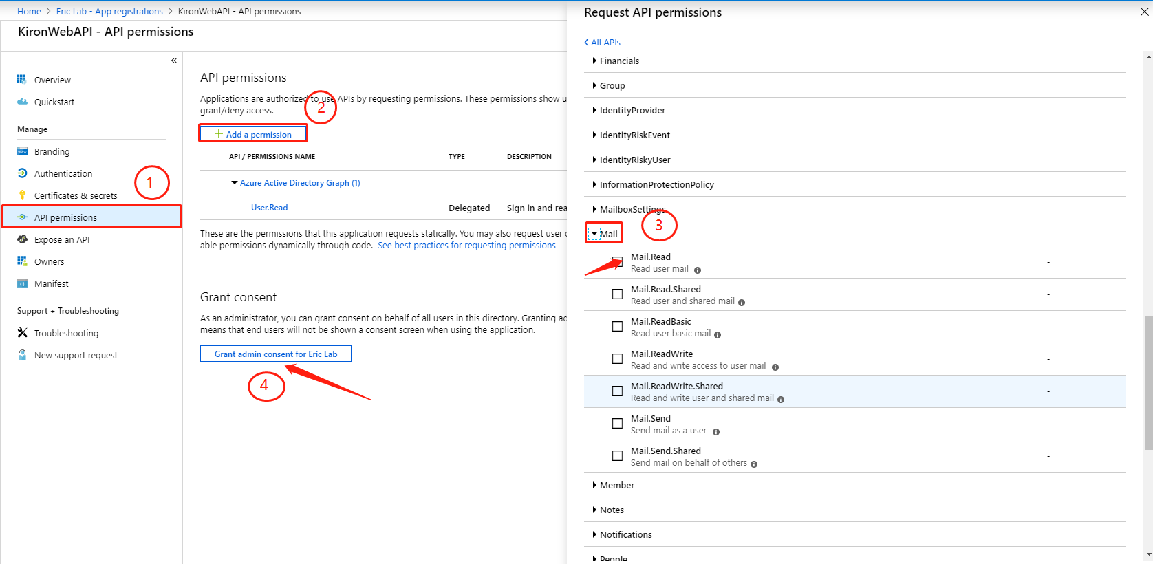 “应用程序”权限允许用户读取其他邮箱,由于安全问题,这种方法没有管理员同意,所以我使用‘委托’权限。