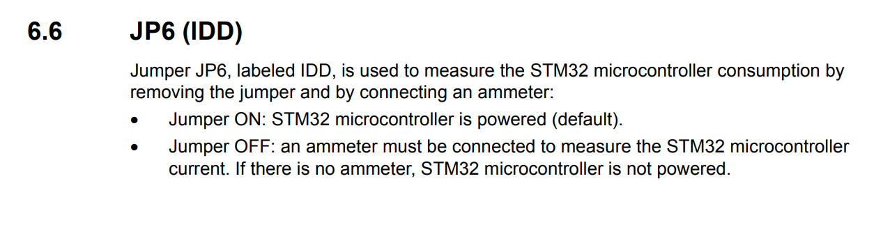 我想在我的uC核心-64评估板(NUCLEO-L073RZ)上测量当前的STM32消耗。手册上说,我只需移除JP6/IDD跳线器,然后将引脚连接到安培计上: