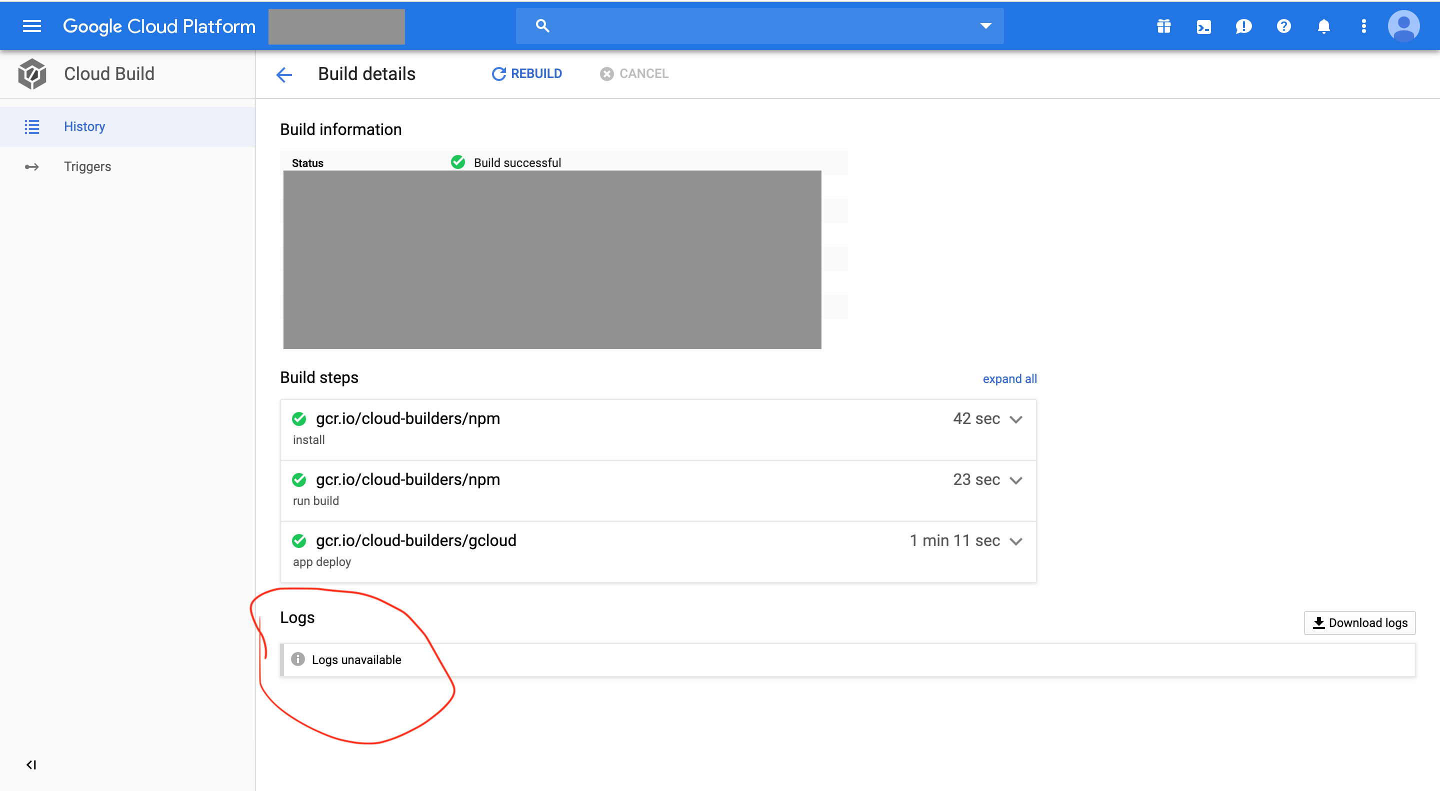 解决方法之一是在将构建提交给您控制的桶(而不是默认的Google管理的--gcs-log-dir桶)时设置gs://[PROJECT_NUMBER].cloudbuild-logs.googleusercontent.com/标志。