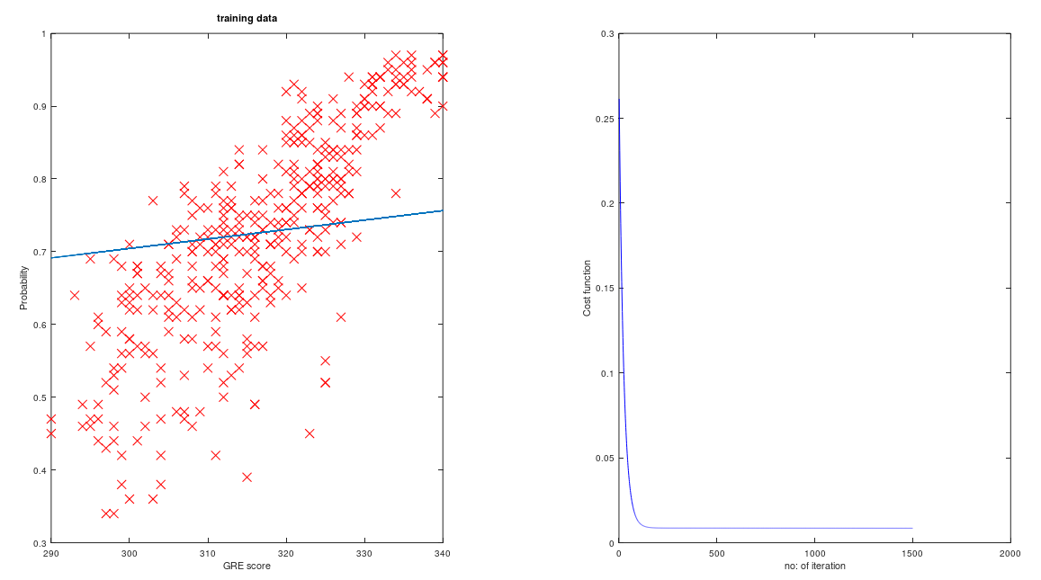 我试图在一个与GRE分数与入学概率有关的数据集上,在Octave 5.1.0中实现线性回归。数据集属于这一类,