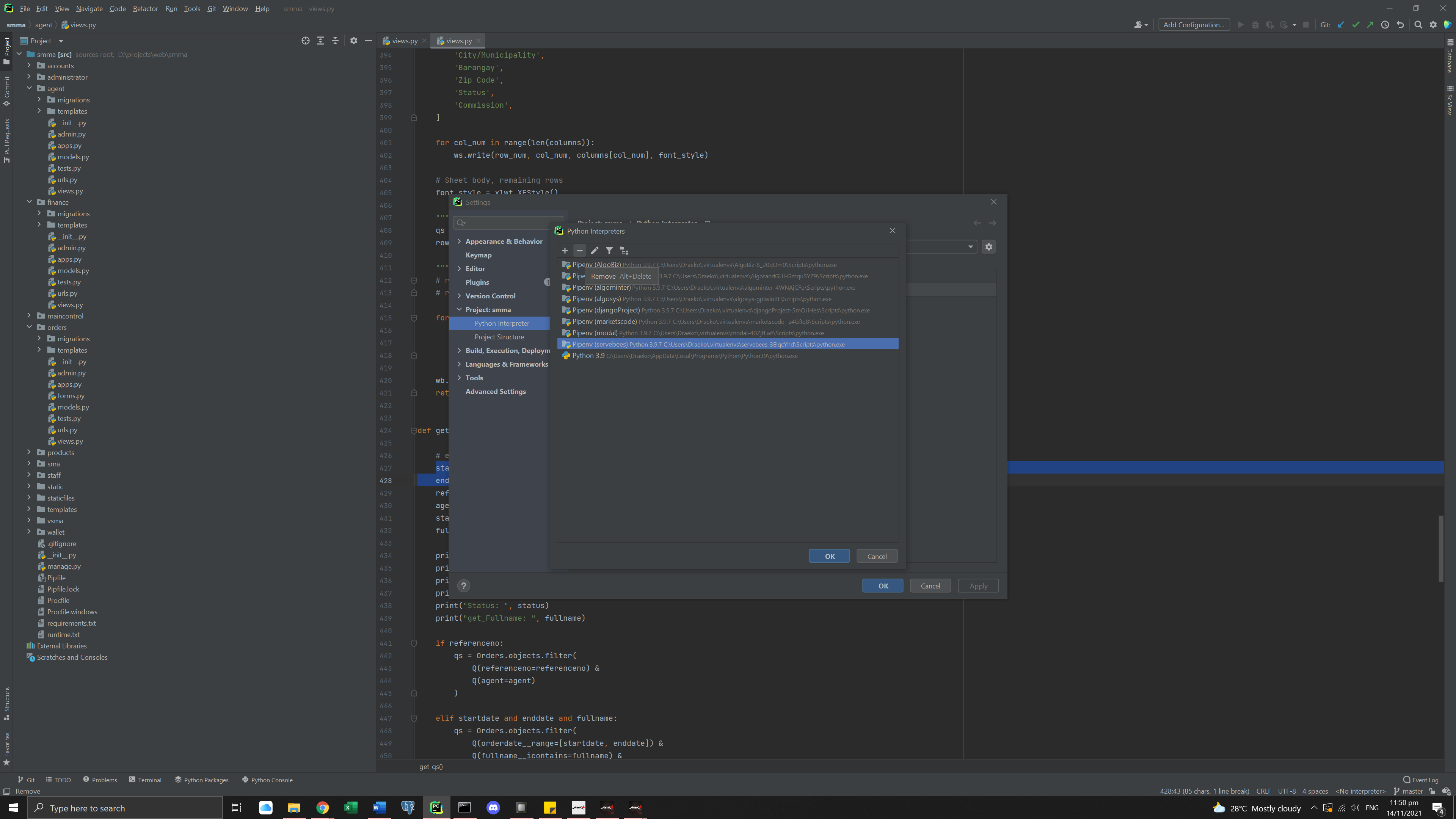 解决方案:打开任何项目,转到Files -> Settings ->项目解释器-> Python解释器,然后删除pipenv项目ex (serve蜜蜂)