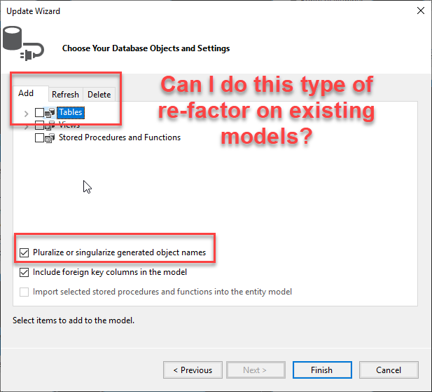 我希望使用实体在导入模型时允许的内置函数,使这些模型在代码中自动变为单数或复数,而不管数据库表名如何,但是,该函数似乎只有在添加新模型时才能工作。