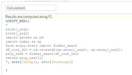 我通过Tableau工作表中的计算字段调用TabPy服务器来运行假设检验:预订率是否因组而有显著差异?