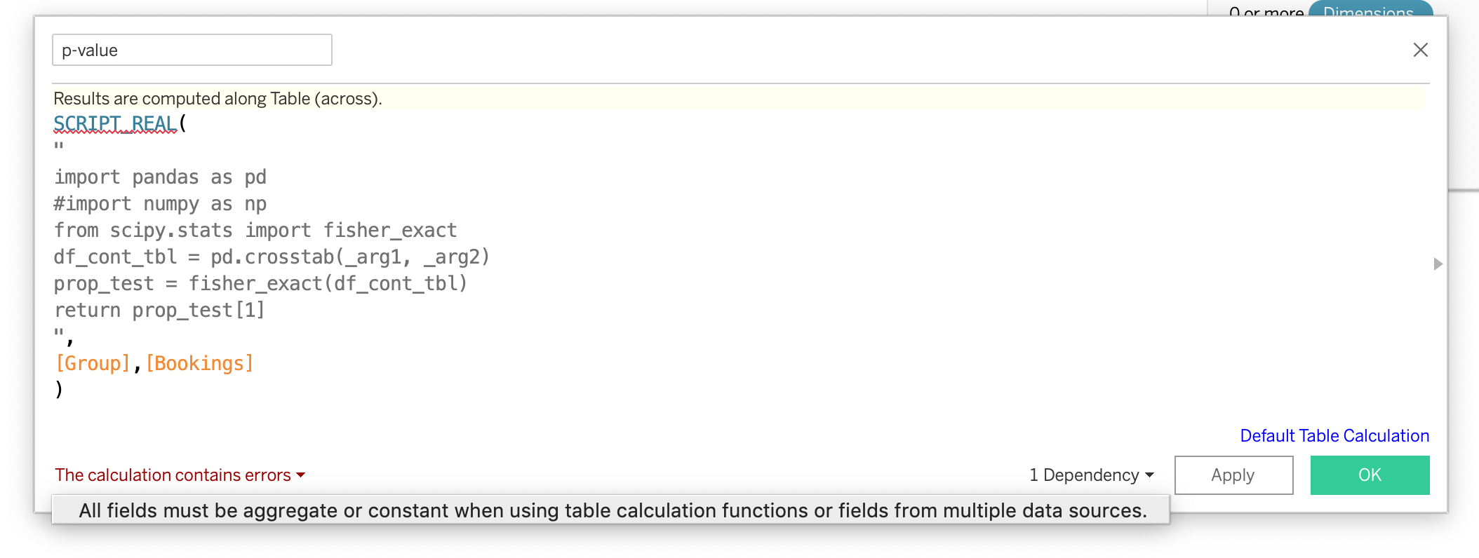 ", [Group], [Bookings] )我收到通知:当使用表计算函数或来自多个数据源的字段时,计算包含错误和下拉-所有字段必须是聚合或常量。