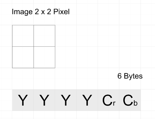 为每个像素确定luma值。颜色信息被划分为Cb和Cr,是从一个2x2像素块计算出来的。因此,最小图像大小将是一个2x2图像块,产生6个字节(即每字节12像素= 12 *4=48位=6字节),参见此处的图形:
