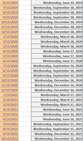 我尝试在Excel上构建一个函数,以获得Mar / Jun /9/ Fri的第三个Wed,这取决于哪个更接近指定的日期。假设今天是2019年6月2日,那么它应该返回6/19/2019,如果是6/19/2019,它应该返回9/18/2019,以此类推。但是,代码不起作用。我已经为您的权限附上了下面的代码。谢谢!