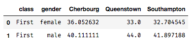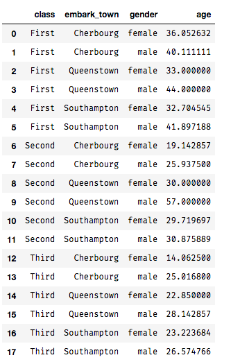 titanic_c = titanic.groupby(['class', 'embark_town', 'gender'])['age'] \