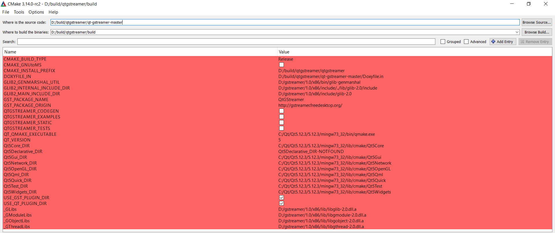 然后我安装了它们,并将bin文件夹添加到系统环境中,这样Cmake就可以在编译GStreamer时识别QtGstreamer所需的依赖项,我下载了最后一个版本的QtGStreamer 1.2.0并使用Cmake生成文件,我链接了所有的依赖项,即QT、Boost和GStreamer。