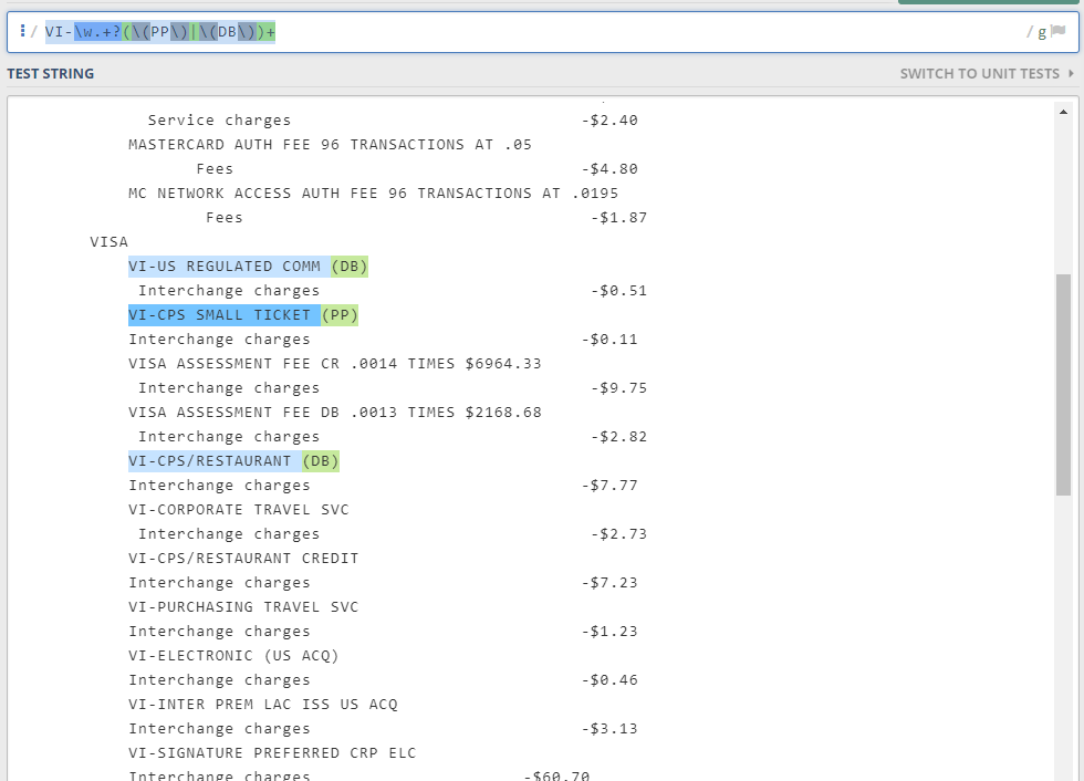 $regex = "/VI-\w.+?(\(PP\)|\(DB\))+/g"; // regex, but it selected the individual row > field. see the sreenshot.