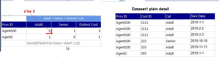 我试着计算每个年龄类别的不同的Cust为每个供应商,并有大的问题在这里。我可以得到正确的CountDistinct客户数量,但不能得到正确的细分成人/高级类别。您是否可以考虑在rdl中实现,因为我真的不能触摸现有的数据集,这是简单的细节,就像在我的图片的右边。
