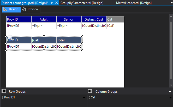 =CountDistinct(Fields!CustID.Value)如果您需要第三列中的总数,则右击下面面板中的“猫”列组,然后选择“添加总=>”。