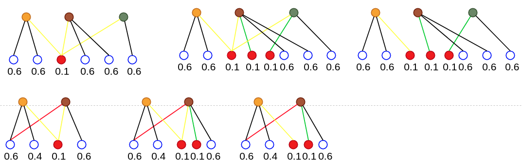 0.2。将二部图分为三个子图,将红色顶点分别复制到三个子图中。0.2。然而,红色边导致二部图不被分割成子图。我的想法: