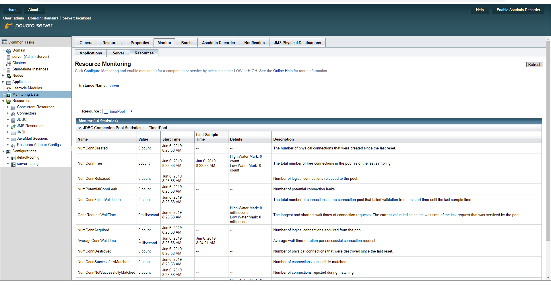 如果您忽略了这一点,只需输入asadmin get --monitor server.resources.__TimerPool,它就会返回
