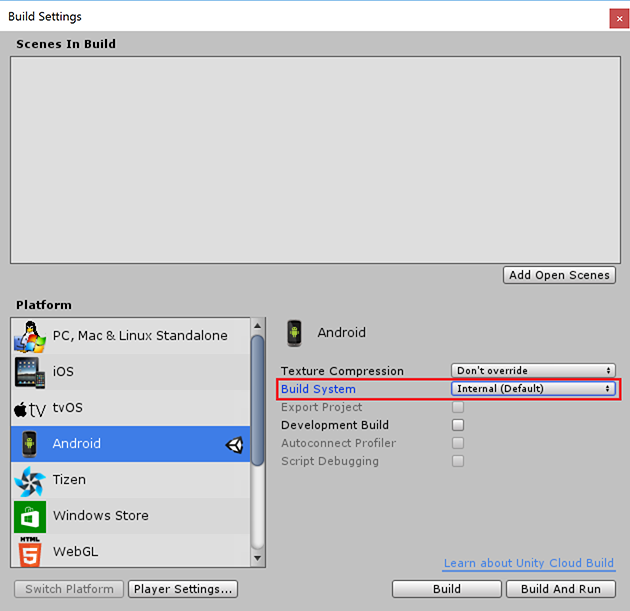 我正在构建一个统一版本2019.1.2f1的虚拟现实应用程序,但是我似乎无法在构建设置中找到“构建系统”选项,它被删除了吗?